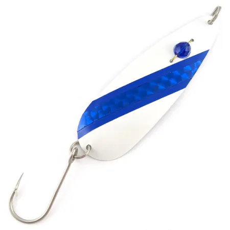 A striking blue honeycomb tape stripe accents the clean white finish of this Red Eye Evil Eye spoon. Measuring 3 1/2" (9 cm) and weighing 1/3oz (9g), the profile is designed for visibility during trolling or casting. The signature faceted blue bead eye, a classic feature of Red Eye Lures made in the USA, is pinned through the stamped metal body. Rated at 5/5, the specimen maintains a vibrant appearance across the paint and hardware, which includes a single hook attached via a split ring. Product Code 23367 exemplifies the maker's use of varied textures to catch light at different angles.