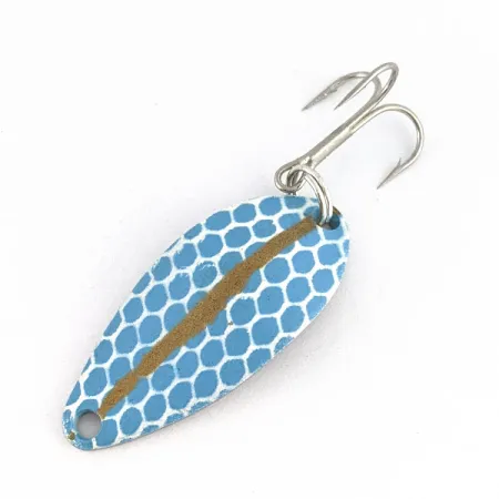 Measuring 1 1/4" (3 cm) in length, this Seneca Little Cleo reflects a pivotal era in tackle history before the brand was acquired by Acme in the early 1980s. The front face features a distinctive blue honeycomb pattern layered over a nickel base, accented by a single gold-toned vertical stripe down the center. Weighing in at 3/16 oz (5 g), the spoon's solid metal construction is paired with a clean, stamped reverse side clearly bearing the "LITTLE CLEO" name. Identified by product code 23405, the specimen retains its original silver-tone treble hook, which is securely attached via a split ring. This lure is unused, maintaining a bright finish across both the painted and polished surfaces. The nickel/blue color combination showcases the manufacturing craftsmanship Seneca was known for during its independent years in the USA.