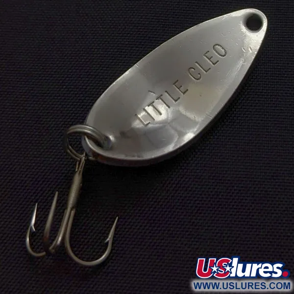 A striking blue scale pattern over a nickel-plated finish defines the visual appeal of this particular spoon. Measuring 1 1/4" (3 cm) and weighing in at 3/16 oz (5 g), this specimen represents the original production era by the Seneca Lure Company before the brand was acquired by Acme in the early 1980s. The back of the lure features the classic 'LITTLE CLEO' stamp deeply impressed into the metal. A vertical gold stripe runs down the center of the scales, providing a distinct contrast against the cool blue hues. This specific item remains in unused condition, showing the clean surfaces and crisp paint lines typical of a well-preserved vintage find. As a 6/5 rated piece, it carries the Product Code 24457. The teardrop shape is a signature design element from Seneca's catalog, intended for versatile casting applications.
