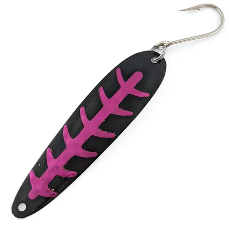 A striking purple skeletal pattern centers the matte black front of this 2/5oz (11.5g) Slammer spoon. Measuring 3 3/4" (9.5 cm) in length, this American-made lure carries product code 22838 and showcases a stark contrast between its dark topside and textured white reverse. The hardware setup includes a single hook connected by a solid split ring, providing a reliable point of contact for anglers. In its 5/5 condition, the finish remains bright and the structural integrity of the metal body is fully intact. This specific color combination of black, white, and purple is a classic choice for visibility in various water conditions during casting or trolling. A clean line tie hole is positioned at the tapered head, ready for a direct tie or a snap swivel.