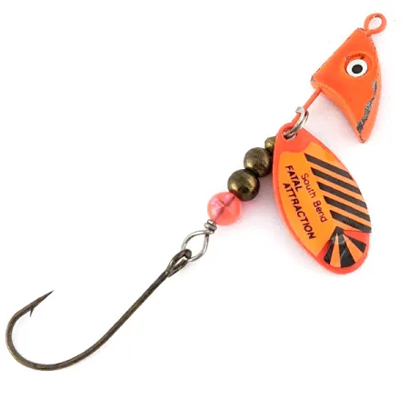 A weight of 2/5 oz (12 g) provides this vintage spinner with substantial presence for casting near submerged structure. Measuring 3 1/2" (9 cm) in total length, the South Bend Fatal Attraction carries product code 22658 and represents a functional piece of USA-made tackle history. The blade is finished in what the manufacturer designated as Hot Pink, presenting as a high-visibility fluorescent tone accented by black diagonal striping and the brand’s name stamped clearly on the surface. Constructed on a straight wire frame, the lure features a fish-shaped lead head with a painted eye, followed by three brass-toned beads and a single pink translucent bead for added visual contrast. Rated at a condition of 4/5, the specimen remains in great shape, with only minor indications of its age appearing as slight surface marks that do not detract from the overall vibrant coloration. The design is completed by a large single hook attached via a wire loop, a configuration often favored for its effectiveness in snag-prone waters.