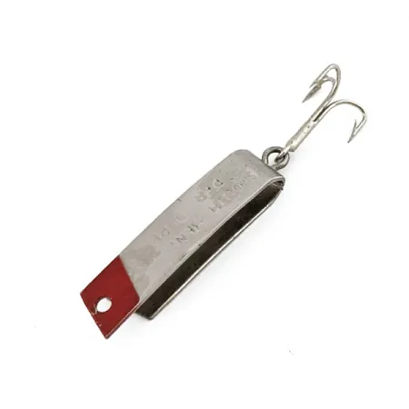 Nickel finish with a splash of red paint on the front tip immediately identifies this classic U-folded metal lure from the USA. Weighing in at 3/32oz (2.3g) and measuring 1 1/4" (3cm) in length, the South Bend Super-Duper 501 represents a distinct period of minimalist tackle design. The body is formed from a single strip of metal folded back onto itself, creating a slim profile that stays stable during a retrieve. Stamped lettering on the side clearly marks the brand and model, providing a tactile link to its manufacturing origins. A single treble hook is secured to the rear loop via a split ring, showing the original hardware configuration. Rated at 5/5, the specimen's surfaces are bright and the red accent remains sharp and well-defined without significant wear. This specific item is cataloged under product code 15315 and stands out as a genuine rarity for collectors focused on mid-century American metal baits.
