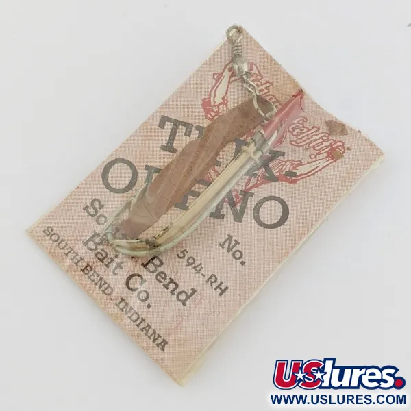 Measuring 1 3/4" (4.5 cm) in length, the silver and red finish on this fly rod lure remains in unused condition as originally packaged on its display card. South Bend manufactured this model 594-RH with a weight of 1/16 oz (2 g), specifically engineered for a sinking action that imitates small insects or minnows. Reaching trout in deeper water during seasonal temperature shifts is achievable because the body reacts to minimal rod tip movement. The design includes a small metal bangle, and the original card provides instructions for adding pork rind to the hook for increased visibility. Information on the reverse of the packaging indicates this series also included the 593 and 594D models for various light tackle applications. Product Code 24506.