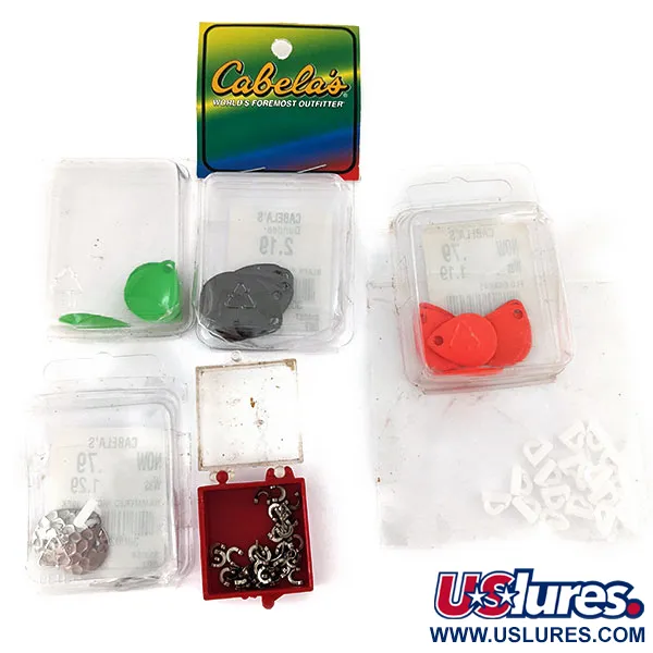 Hammered nickel and vibrant painted finishes characterize this comprehensive assortment of DIY tackle components from the USA. Organized under product code 14056, the lot includes ten black blades measuring 0.98 in (2.5 cm), eight orange blades at 0.79 in (2 cm), and seven green blades also at 0.79 in (2 cm). Classic metallic flash is provided by three hammered nickel blades in the 0.79 in (2 cm) size. These components remain unused, having never been rigged or fished. For the bench angler, the set includes a small red utility box filled with metal clevises and a supplemental bag of white plastic spacers for precise blade rotation on the shaft. Cabela's vintage packaging, complete with the recognizable multi-color header card, highlights the brand's history as a primary source for specialized lure-building supplies.