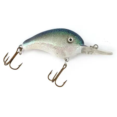 Heavy glitter flakes in shades of teal and emerald coat the upper half of this Strike King 4XD, transitioning smoothly into a shimmering pearlescent belly. Weighing in at 1/3 oz (10 g) and measuring a compact 2" (5 cm), this specimen features the distinctive oversized clear bill designed to reach depths between 8–12 ft (2.4 – 3.6 m). The 13828 model is a classic American-made deep diver, featuring an internal rattle system to help locate target species like pike and walleye. The hardware remains in excellent shape, with the original bronze-finished treble hooks showing no signs of age. Rated at 5/5, the finish is vibrant, and the small silver eyes with black pupils are set within the glittered surface. This floating lure is built for both casting and trolling applications, retaining its original factory luster across the entire body.