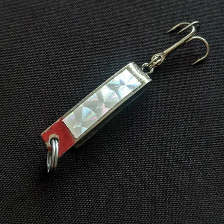 Stamped clearly on the reverse side with "PAT. NO. 2719378," the nickel body of this South Bend Super-Duper 501 demonstrates a unique hybrid design. Weighing 3/32oz (2.3g) and measuring 1 1/4" (3 cm), the lure utilizes a distinctive folded metal geometry that combines the properties of a spinner and a spoon. This specimen, identified by product code 20084, features a strip of multi-faceted prism tape and a localized red paint accent near the forward split ring. The hardware consists of original split rings and a treble hook, all appearing in 5/5 condition with the plating remaining bright and reflective across both surfaces. The compact profile is designed for light-line angling, where the varied surfaces are intended to catch and reflect light during retrieval.