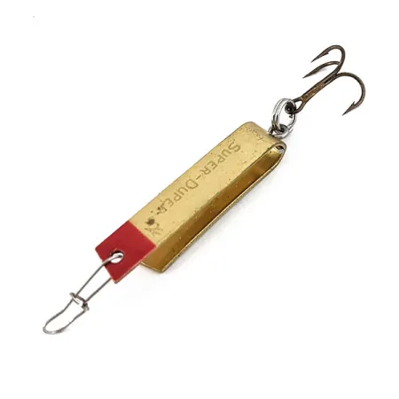 Red paint highlights the tip of the gold-finished metal frame, providing a classic strike point for the Luhr Jensen Super-Duper 502. Identifying this specific specimen is the "SUPER-DUPER" stamp along the side of its unique hairpin-shaped body. Measuring 1 1/4" (3cm), the lure retains a 5/5 condition, showing the bright surfaces expected of a well-preserved piece. It carries product code 15316 and is equipped with a factory-standard treble hook secured by a split ring. At a weight of 3/32oz (2.5g), the design is intended for light-line casting or trolling for trout and panfish. A wire snap is already attached to the lead hole, ready for immediate attachment. This USA-made classic reflects the functional simplicity of Luhr Jensen's mid-century metalwork.