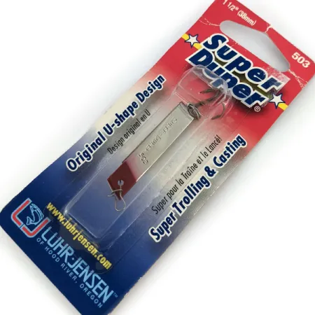 Nickel and red finishes characterize the visual profile of this Luhr Jensen specimen. Weighing in at 1/8 oz (4.3 g), the 13722 product code model utilizes the iconic U-shape design that Luhr Jensen made famous out of Hood River, Oregon. The metal body measures 1 1/2" (3.5 cm) and features a distinct red tip near the line tie, contrasting against the polished nickel surface. As an unused lure (rated 6), it arrives in its original factory packaging, which highlights its suitability for both trolling and casting. The single treble hook is securely mounted to the trailing edge of the U-bend, ready for field use or display in a vintage collection.