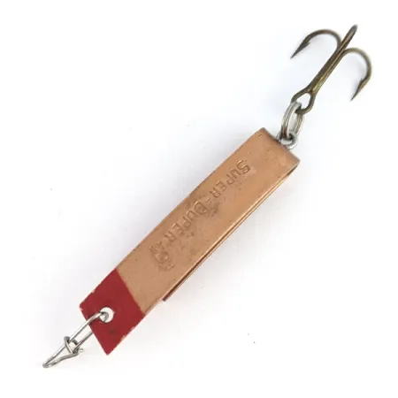 Copper plating covers the majority of this 1 1/2" (3.5cm) metal lure, which is punctuated by a bold red accent on the leading edge. Identified as Product Code 23374, the Luhr Jensen Super-Duper 503 utilizes an iconic "U" shaped folded design to catch water during a retrieve. At a weight of 1/8oz (4.3g), it remains a versatile choice for anglers targeting trout, bass, or panfish via casting or trolling techniques. The surface is in excellent condition, rated 5/5, with the manufacturer's name and patent stamp crisp on the metal. This vintage piece comes equipped with its original treble hook and attachment snap, showcasing the simple yet effective hardware characteristic of mid-century USA tackle. The bend in the metal is precisely engineered to facilitate movement beneath the surface without the need for complex internal components.