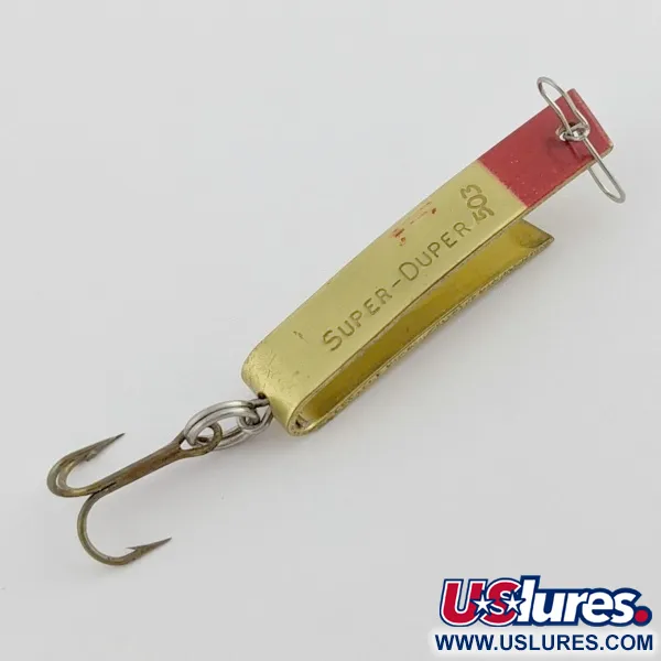 A vibrant red tip provides a sharp contrast against the gold-finished metal of this classic U-shaped spoon. Stamped directly into the body is the name SUPER-DUPER 503 along with Patent No. 2719378, indicating its authentic Luhr Jensen heritage. This USA-made specimen features black lettering that remains crisp, contributing to its 5/5 condition. The unconventional folded design is engineered to catch water effectively when trolled or cast on light line. All original hardware is present, including a treble hook attached via a split ring and a wire snap at the line-tie end. Often found in the kits of dedicated trout and panfish anglers, this model is a quintessential piece of mid-century fishing history. The gold plating retains its original shine across the entire length of the folded metal frame. This item is cataloged under Product Code 24435.
