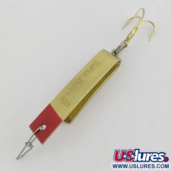 A striking finish accented with a bold red tip defines this 1 1/2" (3.5 cm) U-shaped metal lure, which weighs in at 1/8 oz (4.3 g). The Luhr Jensen Super-Duper 503 features a unique folded body design that is stamped with the manufacturer name and patent number 2,715,274. This specific geometry makes it suitable for both casting and trolling, particularly when targeting trout, perch, or panfish. On the brass-toned surface, the markings are clearly legible, indicating a well-maintained 5/5 condition. The weighted bend of the metal provides a specific hydrodynamic profile that sets it apart from standard spoons. Each side of the folded metal plate catches light differently, with the red paint providing a high-contrast trigger point at the nose.