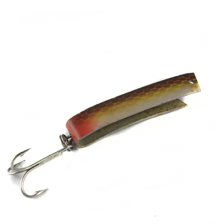 Boasting a distinct U-shaped bent metal design, this 11g (2/5 oz) spoon reflects the clever engineering Luhr Jensen brought to the fishing world from their USA manufacturing base. The 5.5cm (2 1/4") body features the "Brown Snake" finish, characterized by a dark honeycomb scale pattern along the top edge that fades into a warm yellow-gold midsection and ends with a deep red flourish at the nose. A sturdy split ring connects a single treble hook to the rear of the lure, which is constructed from a single strip of metal folded back on itself. This stamped metal body is substantial for its size, designed for efficient casting or trolling applications. Looking at the exterior, the finish remains vibrant with very light signs of use, earning it a 4/5 condition rating. The original paint is well-preserved across the unique crimped profile of the metal strip, and the product code 0502 is clearly associated with this 509 model size.