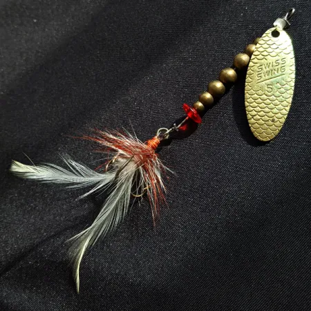 Stamped into the scale-patterned brass blade, the SWISS SWING 5 designation marks this 1/4 oz (7 g) spinner as a well-preserved piece of Renosky Lures history. Measuring 2 3/4" (7 cm) in length, the lure’s body is constructed from a sequence of graduated brass beads that provide the necessary weight for casting on light spinning tackle. At the base, just above the feathered treble hook, sits a small red plastic disk that provides a localized flash of color against the metallic sheen. This specific specimen, identified by product code 17988, features a dressing of orange-brown and white feathers that have remained full and intact. Rated at 5/5, the brass finish and hardware show the quality of USA-based manufacturing typical of Renosky's vintage output. The textured blade is designed to catch light while the wire-through construction connects the top swivel directly to the dressed hook.