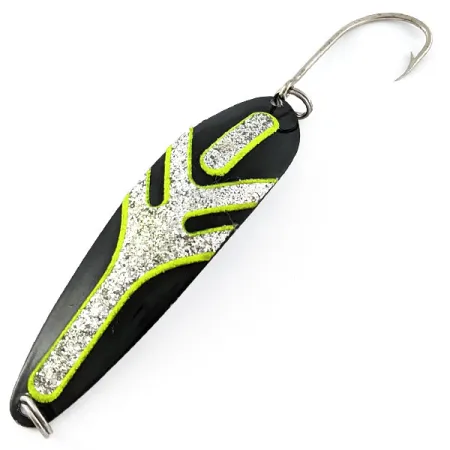 Black finishes rarely looked as striking as they do on the Totem color scheme found on this 1/4 oz (8g) specimen from The Producers. Measuring 3 1/2" (9cm) in length, the Hookster Totem #4 features a distinctive silver glitter textured inlay outlined in high-visibility chartreuse, designed to catch light deep in the water column. This specific lure, identified by product code 21096, is in 5/5 condition, appearing completely unused with a clean matte black front and a bright silver reverse side. Proudly manufactured in the USA, the construction is tailored for trolling, equipped with a stout, single J-hook and durable split rings at both ends. The contrast between the dark profile and the UV-reactive chartreuse borders makes this a standout choice for big-water anglers targeting species like salmon or trout. The hardware remains tight, and the silver flake within the central pattern retains its original reflective properties.
