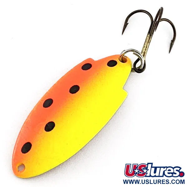 A vibrant yellow-to-orange gradient defines the face of this 1 3/4" (4.5cm) spoon, punctuated by bold black circular spots. The reverse side reveals a stamped copper finish with the "THOMAS BUOYANT T102" mark, a tribute to the legendary design first patented in the USA in 1946. At a weight of 1/4oz (7g), this lure carries the product code 23188 and is in superb shape, meriting a 5/5 rating for its bright colors and well-maintained treble hook. Its uniquely notched profile is engineered to create a frantic motion that mimics fleeing baitfish when cast or trolled. This specific piece retains its jewelry-quality shine, a signature of the manufacturer's commitment to high-visibility finishes. The split ring hardware is clean and tight, ensuring the lure is ready for the water or a collector's display box.