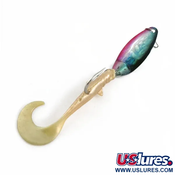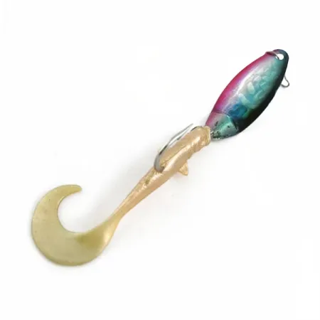 A vibrant fuchsia and teal metallic blade transitions into a soft, pearlescent cream curl-tail on this unique hybrid design. This Berkley Blade Dancer, identified by product code 23651, is a classic example of American-made tackle engineering from the USA. Weighing 2/5oz (11g) and measuring 2 3/4" (7cm) in length, the lure is constructed with a stamped metal spoon head connected to a single, sharp upturned hook embedded within the soft plastic body. The pearlescent finish on the soft tail remains remarkably clean and flexible, contributing to a well-preserved condition rating of 4/5. Looking at the hardware, a small snap is attached to the line tie, designed to facilitate quick changes during casting sessions. The color gradient on the metal blade is particularly sharp, providing a distinct contrast against the neutral tones of the soft body component intended for mid-water column retrieval.