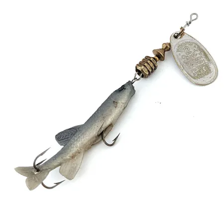 Assembled in the USA with components precision-made in France, this 3/16 oz (6 g) spinner represents a classic era of 1970s tackle. The silver-colored Comet blade is clearly stamped with the Mepps logo and size #2, showing the quality craftsmanship expected from product code 13775. Measuring 3 1/2" (9 cm) in total length, the setup features a realistic soft plastic minnow body with a darker dorsal side and lighter belly tones. The brass body section consists of distinct grooved and conical segments that provide the necessary weight for casting. This particular specimen is in 5/5 condition, appearing well-preserved with sharp hardware, including a single belly hook and a treble hook near the tail. The detachable nature of the minnow allowed for versatility on the water, a hallmark of the Comet Mino series. The silver finish on the blade remains bright, contrasting against the muted, lifelike tones of the soft trailer.