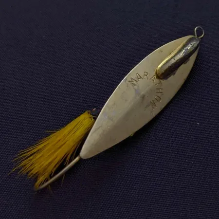 Stamped with the "MARATHON" name across its face, this gold-plated weedless spoon utilizes a fixed lead keel soldered onto the back for weight and stability during the retrieve. Measuring 1 3/4" (4.5 cm) and weighing 3/16 oz (6 g), the design centers on a single hook protected by a wire weed guard to navigate through lily pads and aquatic vegetation. A bright yellow hair dressing is tied near the hook point, adding a visual element to the gold finish of the metal blade. This specific specimen remains in 5/5 condition, showing well-preserved plating and a clean, full bucktail. Product Code 24597 features the characteristic stamped branding used by the manufacturer between 1929 and 1979.