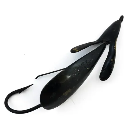 Weighing in at 1/3 oz (9 g), this distinctively shaped metal spoon represents a significant piece of Ohio fishing history from the mid-20th century. Johnnie O'Neil developed the Weed Wing in 1957 in Akron, Ohio, eventually securing a patent in 1962 before the design was later acquired by Harrison Industries. This 2 1/4" (6 cm) specimen features a solid black finish and is built for navigating dense cover with its integrated wire weed guard shielding the single hook. The unique "wings" positioned near the line tie eyelet distinguish O'Neil’s design, which is listed under product code 5066. Stamped markings on the inner spoon body confirm its USA manufacturing roots. The black coating shows some light wear along the edges, reflecting its journey through a tackle box, while the metal and hardware remain sturdy, resulting in a condition rating of 4/5.