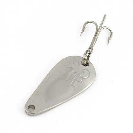 Nickel plating provides a clean, bright finish across the stamped surface of this American-made classic, showcasing the historic craftsmanship of the Weller company. At just 1" (2.6 cm) in length and weighing 1/8 oz (3.5 g), the Weller Gypsy King Deluxe, Product Code 23042, stands as a rare lightweight find for specialized vintage collections. The face of the spoon is detailed with an intricate engraved pattern featuring elegant flourishes around a central stylized emblem, a signature element of the Deluxe series. Its reverse side is smoothly polished to a high-shine nickel luster. The lure remains in 5/5 condition and is unused, retaining its original integrity from the line-tie hole to the silver-toned treble hook. This hardware is secured by a sturdy split ring, maintaining the solid construction typical of mid-century USA production.
