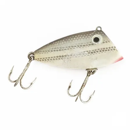 Barfish scales on this Bayou Boogie are rendered in a metallic silver with fine horizontal stripes that mimic small forage. At 2" (5 cm) long and 1/3 oz (10 g) in weight, the sinking body is shaped with the classic Whopper Stopper sloped forehead. A 5/5 condition rating reflects the well-kept state of the paint and hardware on this specific item, marked as product code 24588. The red-painted mouth provides a sharp contrast against the pale belly and silver flanks. A line tie is positioned on the crest of the head, designed specifically for the sink-and-retrieve techniques typical of this lipless model. Two treble hooks are positioned at the belly and tail to balance the compact profile.
