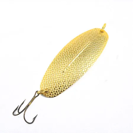 Weighing in at 1oz (28g), this heavy-duty Canadian spoon features a distinctive honey-comb scale texture across its brilliant gold surface. This 4" (10cm) Williams Wabler, cataloged under product code 0726, is centered by the brand's iconic longitudinal ridge designed to maintain stability across various retrieval speeds. Williams is historically noted for utilizing precious metal plating in their manufacturing process, and this specimen carries a high-luster gold finish specifically chosen for visibility when targeting large pike or walleye. The hardware consists of a sharp, bronzed treble hook and a reliable split ring assembly, both showing the high quality expected from Canadian craftsmanship. With a condition rating of 5/5, the metal shows no signs of use and retains its original factory shine. The stabilizing rib is a functional hallmark of the Wabler series, ensuring the lure remains tracking correctly whether cast from the bank or pulled behind a boat during a slow troll.