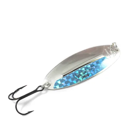 Plated in genuine silver to ensure maximum light reflection at various depths, this classic spoon features a vibrant blue-toned rainbow hologram strip along its side. Weighing 2/3oz (18.9 g) and measuring 3 1/4" (8.25 cm) in length, it belongs to a lineage of Canadian tackle that remains highly sought after by collectors of product code 2187. The face is clearly stamped with the "WILLIAMS W60" designation, while the reverse side bears the "MADE IN CANADA" hallmark near the attachment point. This specimen is in 5/5 condition, maintaining a brilliant finish on both the smooth and textured surfaces. The signature longitudinal ridge, a design element originally patented to provide stability during retrieval, remains crisp and well-defined. It comes equipped with its original heavy-duty split ring and a sharp black treble hook, ready for the tackle box or the display case.