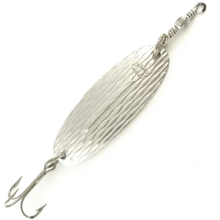 Tipping the scales at a nimble 1/4oz (7g), this specimen features the classic dimpled texture characteristic of the Hammered Silver finish. Measuring 2 1/4" (5.7cm), the Williams Wabler W40 is an iconic piece of Canadian angling history, easily identified by the distinct stabilizing ridge running down its center. This ridge was a design choice intended to prevent line twist during various retrieve speeds, a feature that helped launch the series into mass production after 1920. The genuine silver plating on this particular lure, identified by product code 6629, remains in 5/5 condition, reflecting light with the brilliance that has attracted pike and walleye for generations. Originally developed in Buffalo before production shifted entirely to Canada in 1978, the Wabler maintains a reputation for high-quality metalwork. The hardware, including the split rings and treble hook, shows the robust construction Williams is known for, ensuring it remains a noteworthy part of any vintage tackle collection.