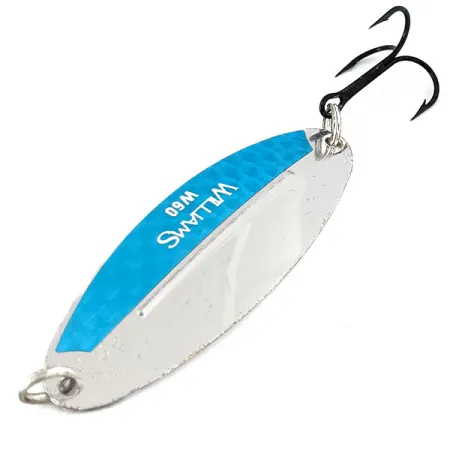 Measuring 3 1/4" (8.2 cm) in length, this classic Canadian-made spoon features the signature genuine silver plating that has defined the brand's reputation for decades. This specific Williams Wabler W60, bearing product code 15008, showcases a striking Silver / Blue finish where a honeycomb-textured blue strip provides a sharp contrast against the highly reflective metal. Weighing in at 3/4 oz (21 g), the spoon is built around a unique stabilizing ridge that runs the length of the body, a structural feature designed to maintain balance during a steady retrieve or while trolling. The hardware remains in top form, including a sharp black treble hook and robust split rings. Collectors will appreciate the crisp stamped lettering on the face and the "Made in Canada" mark on the reverse. Looking at the specimen's 5/5 condition, the silver plating is exceptionally clean and retains its original luster. It is a well-preserved example of the Wabler series, intended for targeting larger freshwater species through casting or deep-water trolling.