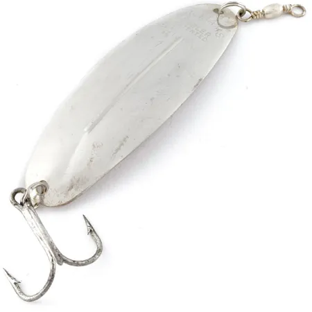 Silver plating defines the classic aesthetic of this specimen, a hallmark of the Williams brand that ensures a distinct flash underwater. Tipping the scales at 1oz (28g), this heavyweight lure is built for serious distance and depth. The signature raised longitudinal ridge provides the structural stability that has made the Wabler series a staple in tackle boxes since its serial production began in 1920. This particular Williams Wabler W70, identified by Product Code 19103, carries the legacy of Canadian manufacturing. Presenting in 4/5 condition, the silver finish is well-preserved, showing only the softest signs of its vintage age while maintaining a bright, reflective surface. The concave side features the distinctive 'WILLIAMS WABLER PATENTED' stamping, a detail valued by collectors. Equipped with a sturdy treble hook and a barrel swivel, this lure remains a functional choice for targeting large pike or walleye.