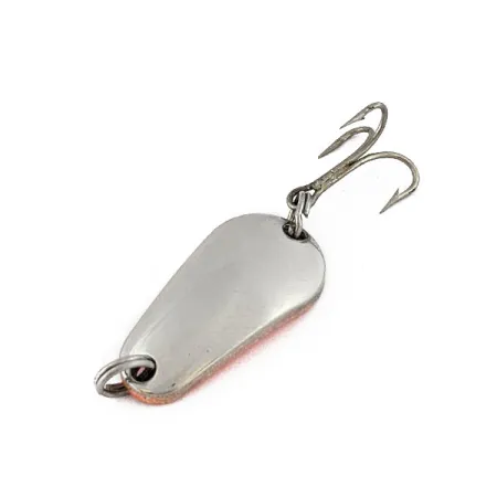Polished nickel covers the face of this 3/16oz (5g) spoon, providing a classic flash suitable for a variety of water conditions. Acme Tackle Company remains a staple in American tackle boxes, and this Wob-L-Rite specimen is a testament to their durable stamping process. Measuring exactly 1" (2.6cm), the compact metal body is rigged with a sharp treble hook and a heavy-duty split ring. While the front shows a mirror-like metallic finish, the reverse side features a vibrant orange UV coating designed for high visibility, especially under the light spectrums shown in the supplemental imagery. The teardrop profile and balanced weight distribution make it a reliable choice for long-distance casting from the bank or a boat. This particular lure is in 5/5 condition, maintaining a clean surface and bright coloration throughout. Identified by product code 18214, it represents a versatile combination of traditional metalwork and modern fluorescent paint technology.