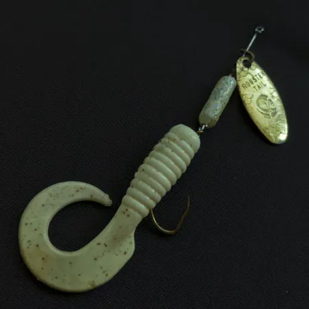Stamped clearly with the "ROOSTER TAIL" mark and the iconic fish logo, the brass willow-leaf blade identifies this Yakima Bait spinner as a classic piece of Americana. This specimen, carrying product code 20716, weighs 1/8 oz (3.6 g) and measures 2 1/4" (6 cm). Instead of the usual feather dressing, this lure features a white, ribbed curly-tail soft plastic trailer mounted on a gold-finish hook. The central weighted body has a light, speckled appearance, sitting just behind the clevis that holds the brass blade. Evaluating its physical state, the lure earns a 4/5 condition rating; the brass shows some light surface marks from time spent in a tackle box, and the soft plastic body remains intact with its original texture. The inline wire remains straight, ensuring the components are properly aligned from the line tie down to the hook.
