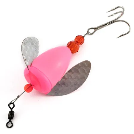 Pink finishes on these winged drift bobbers have a long-standing reputation for triggering strikes from salmon and steelhead in moving water. Identified by product code 23032, this Yakima Bait creation measures 4" (10cm) and weighs in at 1/4oz (8g). The bright pink buoyant body is paired with two textured silver mylar wings designed to catch and reflect light even in low visibility. On the terminal end, you will find a pair of faceted orange beads positioned ahead of a sharp treble hook, while the front end features a small red bead and a sturdy black swivel for line attachment. This specific specimen is in unused condition, earning a 5/5 rating. Anglers often rely on the flotation properties of the Worden’s Spin N Glo to keep bait suspended in the strike zone for walleye or trout, though it is equally effective for saltwater species like fluke. The wire-through construction ensures that the internal components remain secure and rotate freely in the current.