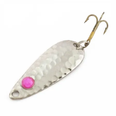Hammered textures across the nickel surface define this 1 3/4" (4.5 cm) spoon, catching light from multiple angles through its dimpled exterior. A distinct pink rectangular strip is placed on the concave face for additional visibility. This specific specimen, cataloged under Product Code #24573, weighs a nimble 3/16 oz (6 g) and is accented by a small pink bead near the tail eyelet. The metal finish is bright and maintains high reflectivity, earning a condition rating of 5/5. Its traditional teardrop shape narrows towards the attachment point where the treble hook is mounted.