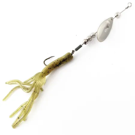Green soft plastic trailer with prominent black flakes defines the rear of this Worth June bug spinner, making it a distinctive find for collectors of vintage USA-made tackle. Measuring 4 1/4" (11 cm) and weighing 3/16 oz (6 g), this specimen features the classic offset blade design synonymous with the June bug name. This specific construction ensures the silver-toned blade rotates immediately upon retrieval without sticking, a mechanical reliability that the Worth company was well known for. The wire harness is decorated with four polished metal beads and a small cylindrical weight, leading to a single hook embedded in the hula-grub style body. Carrying the product code 20141, this lure remains in 5/5 condition, showing no signs of age on the metallic components or the supple plastic tentacles. Its design is tailored for a steady retrieve where the spinning blade creates a visual contrast against the translucent green body.