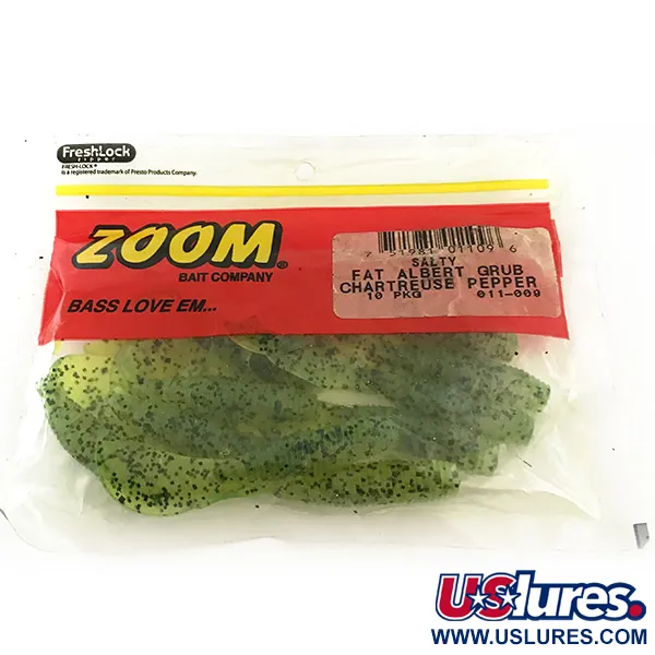 Chartreuse Pepper is the standout color for these specimens, featuring a high-visibility translucent green base loaded with fine black flake. Measuring 3 1/4" (8.25 cm), these soft plastics represent a quintessential design from the Zoom Bait Company of Watkinsville, Georgia. The Fat Albert profile is characterized by a heavily ribbed, chunky body that tapers into a thin, wide-profile sickle tail. This specific package, identified by product code 6678, contains 10 lures that are unused and remain in their original factory zip-seal bag. The ribbed texture on the torso is a deliberate construction choice to increase surface area, a common feature in US-made soft baits intended for jigging. Each grub in this lot shows consistent color saturation and flake distribution across the entire 3.25-inch (8.25 cm) length. The packaging remains intact, displaying the classic red header tape and manufacturer address details.